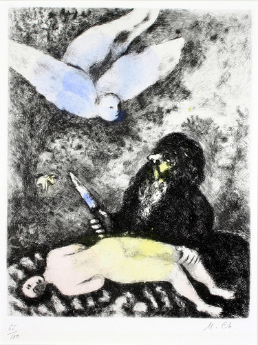 The image below is an etching entitled The Sacrifice of Abraham by Marc Chagall. The same study was done as a watercolor, as an oil painting, and as a drawing in pastel and China ink. Each has symbolic features which are not present in the others. A review of the etching describes it as follows: