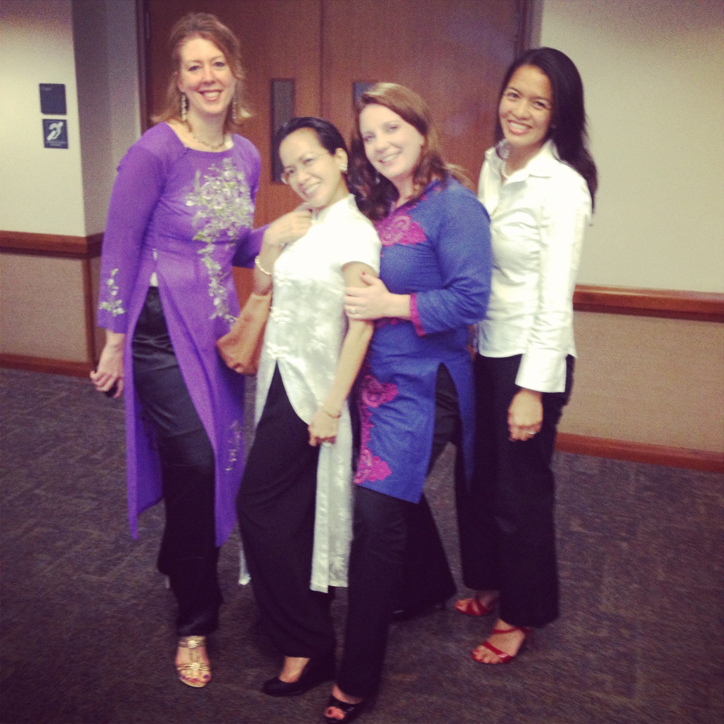 So, what happened in our ward? There was good will from everyone, in pants and in skirts, purple shirts and white. It was no big deal, which is what I thought it would be; some women wear pants every week. I see men in cargo shorts, tee shirts, jeans, and every coloured shirt you can imagine. I once saw a guy in a swim suit attending sacrament meeting (not a Speedo, although I did see a guy hiking the Australian outback wearing a Speedo). We have a lot of out of town visitors as well as investigators. People wear whatever they think will be appropriate or whatever they have with them. We are multi-cultural, and women wear Indian sarees (that show the midriff) and salwar kameez (3rd to the right in the picture – there were also 2 other sisters wearing this on Sunday, both Indian), Vietnamese ao dai (to the left – that’s me – and my friend next to me in the white and black ao dai).