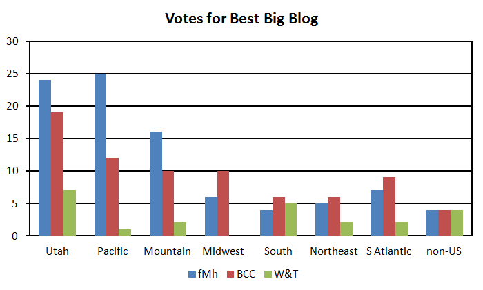 By now you’ve probably seen the Wheaties/Tarefic award winners, and I hope also the resulting argument between fMh and BCC about who deserved to win the coveted Best Big Blog award, and what it really meant. (If you haven’t seen the argument posts, do yourself a favor and check them out. They’re hilarious!) The purpose of this post is to show a few additional results of the voting that you haven’t already seen, and that I hope you might find interesting.
