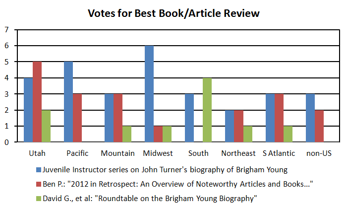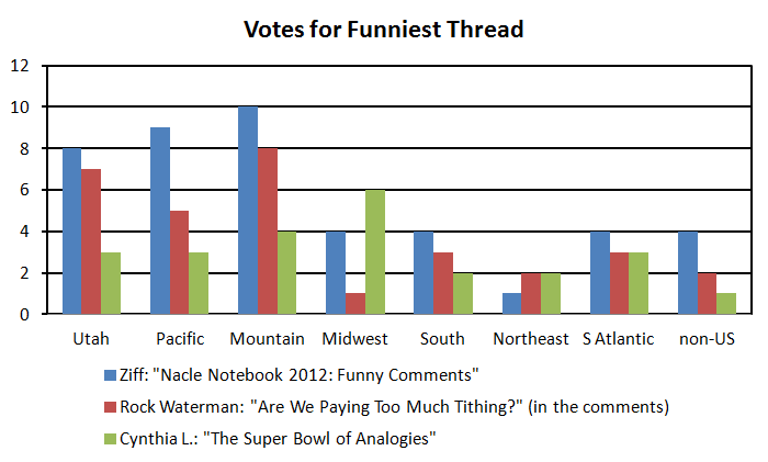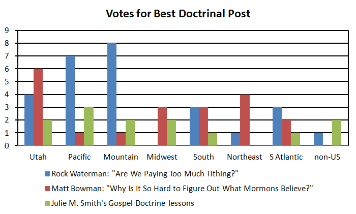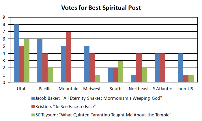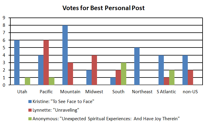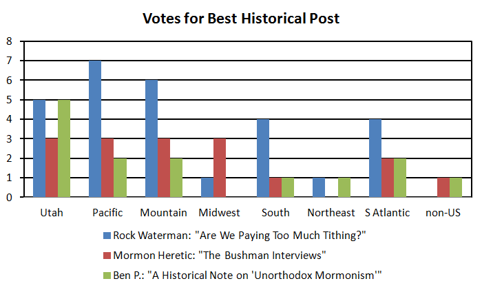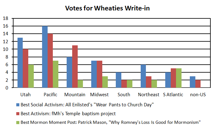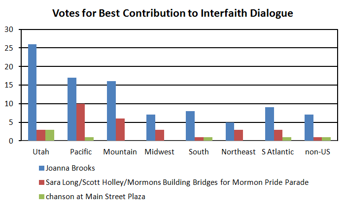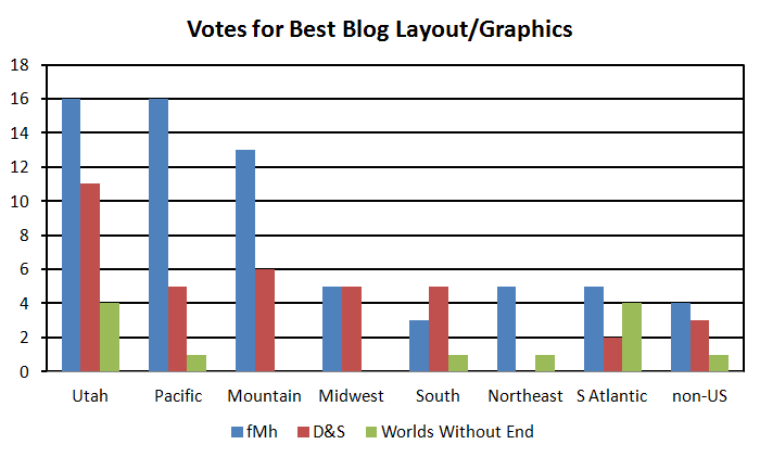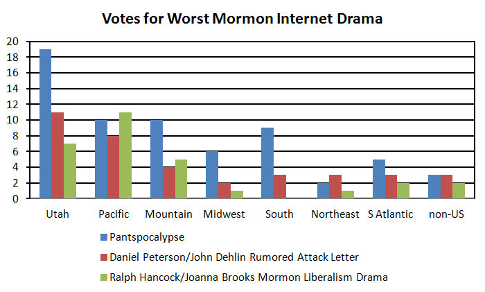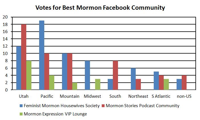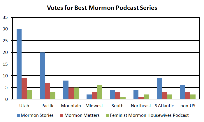 Comparing just the first two, it’s interesting that Mormon Stories won Utah and fMh won the Pacific region, both by fairly big margins.