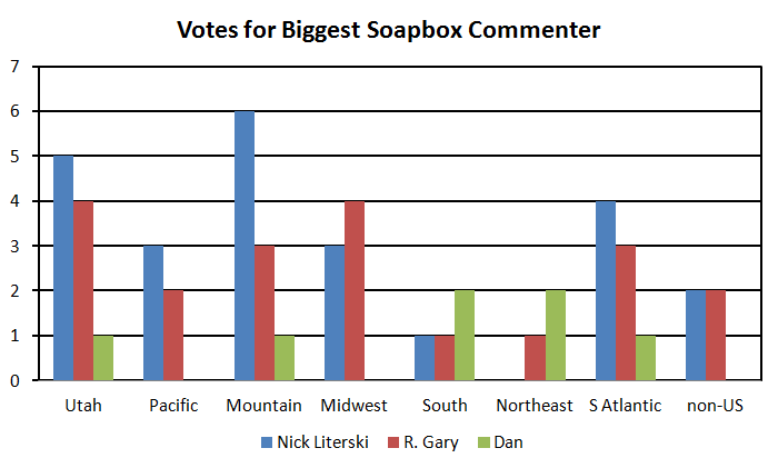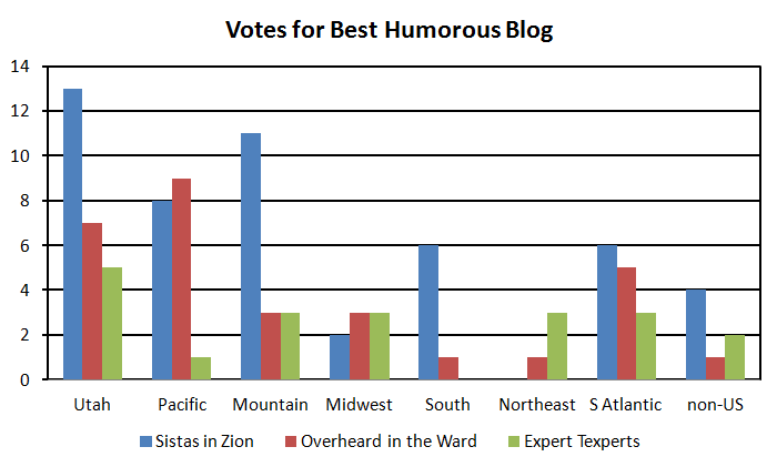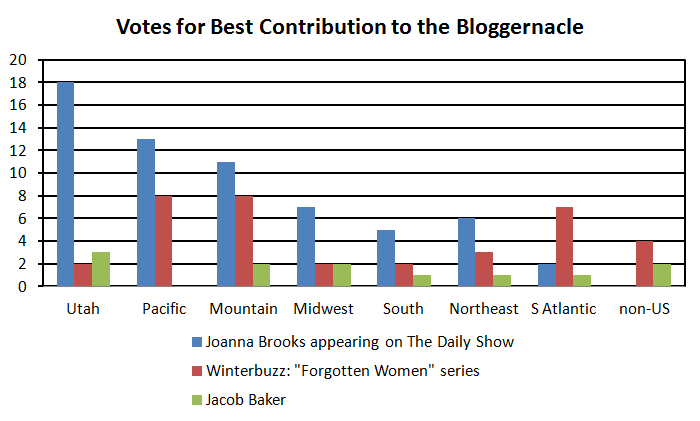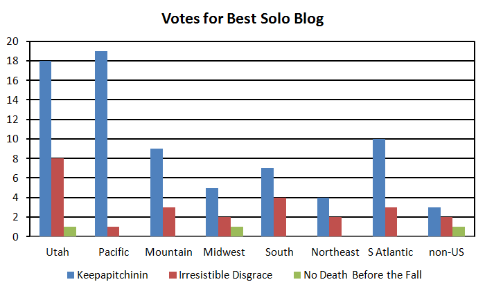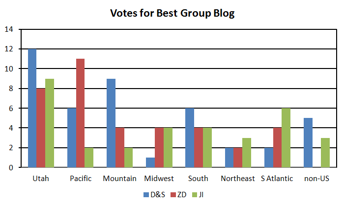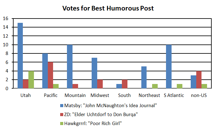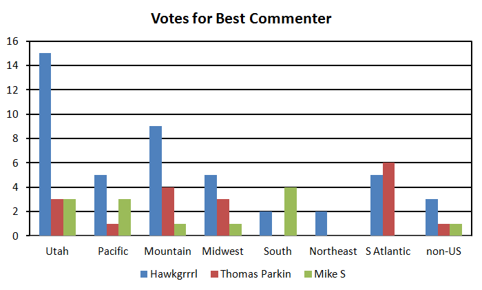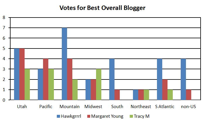 It’s interesting to compare this graph with the previous one. In voting for best commenter, Hawkgrrrl dominated Utah, while in the voting for best blogger, it wasn’t one of her better regions.