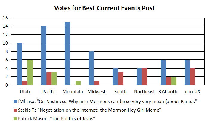 2010: Stephanie, “Fascinating Womanhood” (fMh) (voted best political post) / John C.: “LDS Gospel Teaching” (BCC) (voted best post on contemporary Mormonism)
