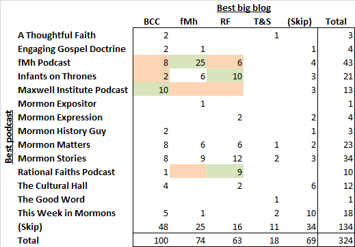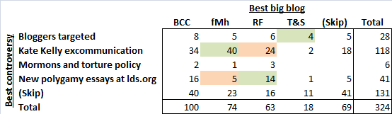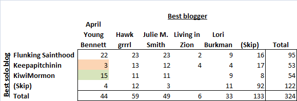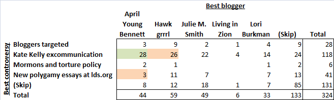 I’ve left cells blank where the vote count is zero to make it easier to see the nonzero counts. I’ve also colored the cells green where there are unexpectedly high vote counts and orange where there are unexpectedly low vote counts. What I mean by unexpectedly high or low isn’t just that the vote count itself is high or low, but that it’s high or low, given the total number of votes drawn by each blog, and assuming voting on one blog isn’t related to voting on the other blog. For example, look at the 8 in the first column for people who voted for BCC for best big blog and Juvenile Instructor for best group blog. This is colored green because, given the total numbers of votes drawn by BCC and JI, this is a surprisingly high number to vote for that combination: two thirds of all JI votes come from BCC supporters alone, even though there are three other blogs in the running for best big blog. The relatively high number of votes suggests that perhaps voting for BCC is related to voting for JI.