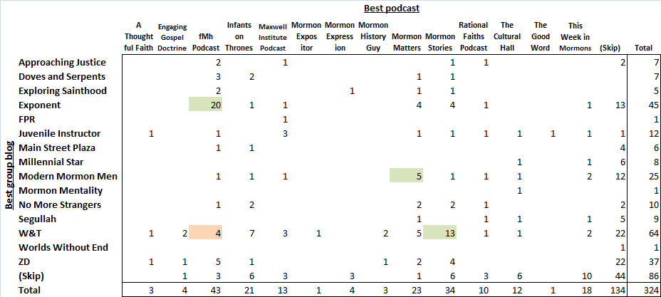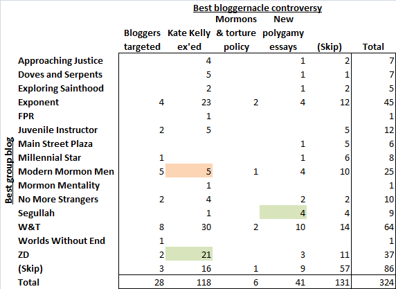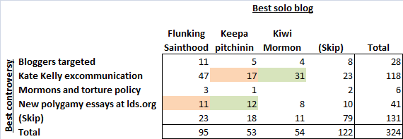 Good questions, Andrew. I looked back at those questions, and the total numbers of votes are quite small, so take this with a grain of salt. Voters for T&S in best big blog were actually slightly more likely than expected to vote for “Mormon of the Year” as worst awards (but the actual minus expected votes is only +0.38). In best group blog, voters for W&T were more likely than expected to vote for BCC’s Boggs-Doniphan award as worst (+3.00 votes) and unlikely to vote for “Mormon of the Year” (-2.40 votes). It was actually voters for ZD that were more likely than expected to vote for “Mormon of the Year” as worst award (+2.05 votes).
