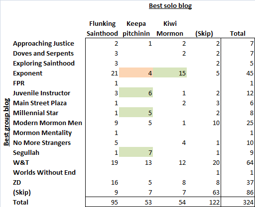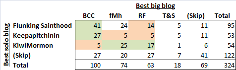 It looks like BCC voters also like JI and Modern Mormon Men, fMh voters prefer the Exponent and ZD (feminist solidarity!), Rational Faiths voters prefer Exploring Sainthood and No More Strangers, and T&S voters prefer W&T.