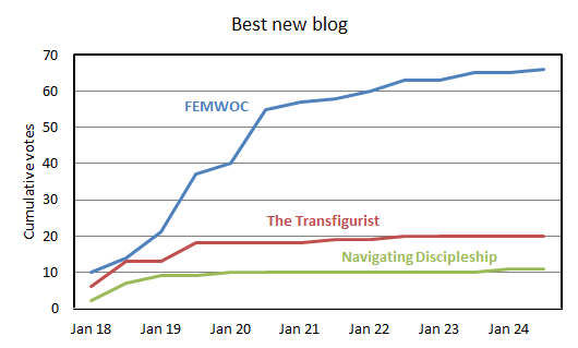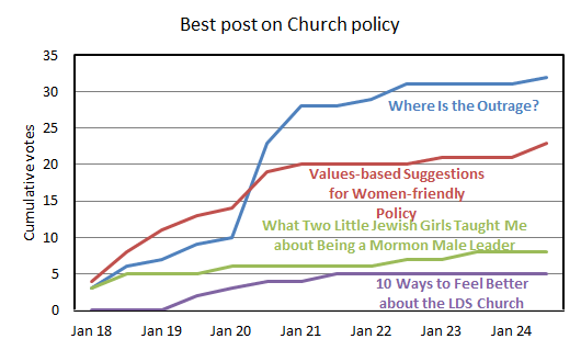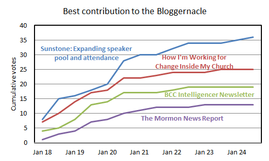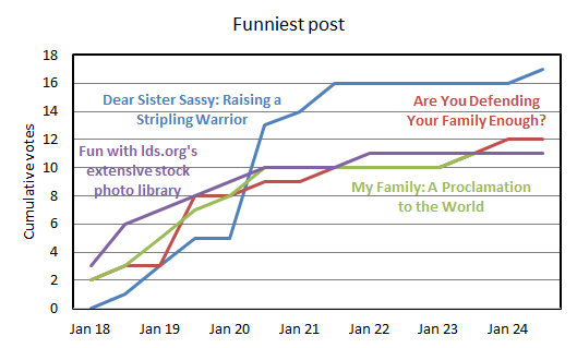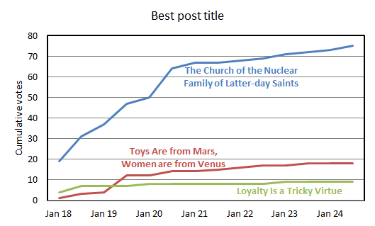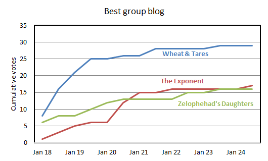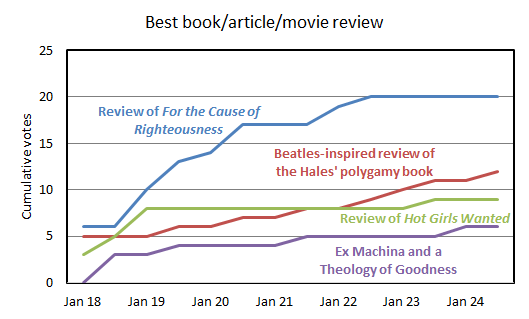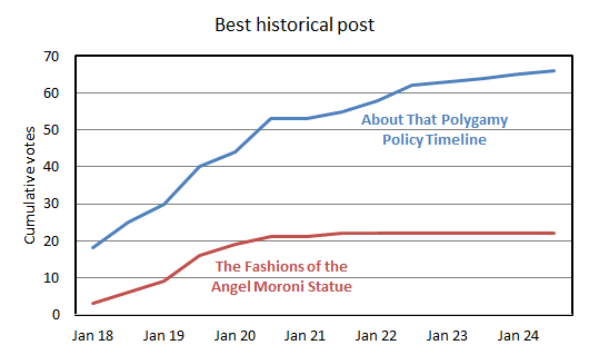 Okay, that’s all I’ve got. Thanks to everyone who voted and gave me some fun data to play with. And thanks to everyone who participated in the nomination process. I always enjoy looking back at the best of the Bloggernacle from the previous year. There’s so much good writing and podcasting out there, and it’s easy for me to lose track of it the moment I’m done reading or listening. I always enjoy having a chance to look back.