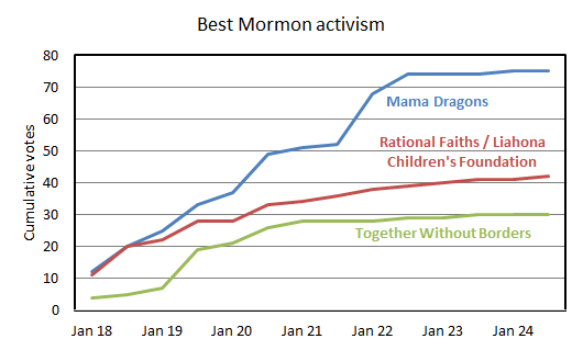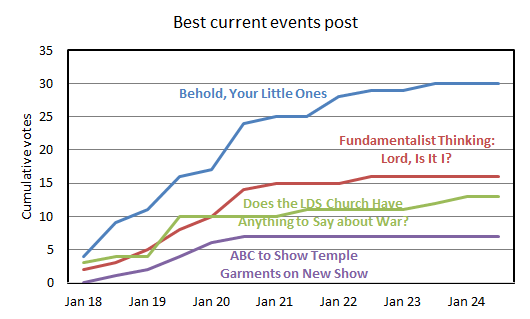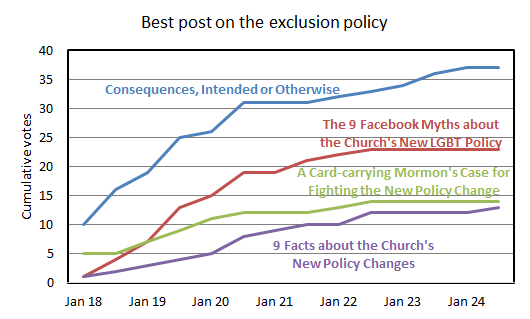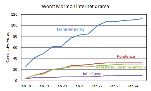 The new exclusion policy won both for best Bloggernacle controversy, and for worst Mormon internet drama. I guess it was definitely the most prominent controversy, and that’s how it won both. Or voters both thought there was good discussion of it, and also got tired of discussing it after a while.