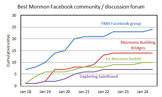 For many questions, the voting was pretty much decided in the first day or two. In this category, though, Lisa Torcasso Downing’s Life Outside the Book of Mormon Belt made a strong run in the middle of the week, but couldn’t quite catch up to Jana Riess’s Flunking Sainthood.