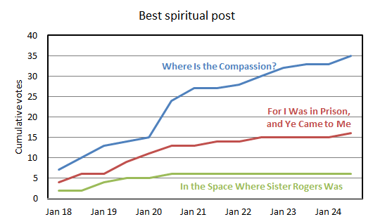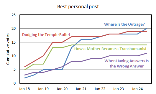 Amy’s post “Where Is the Outrage?” got a big bump at about the same time in both categories in which it was nominated. I guess that shouldn’t be surprising: voters who liked it in one category probably also liked it in the other.