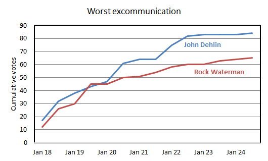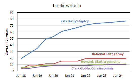 I’ve made up a graph for each question that show the cumulative votes through the week-long polling period. Many of the questions had runaway winners from the beginning, but others were competitive right up to the end. This might be particularly interesting to look at given that the folks here at W&T set up the polls so that the results couldn’t be seen during the polling period, so unlike in past years, voters couldn’t see whether they were voting in a close race or a runaway.