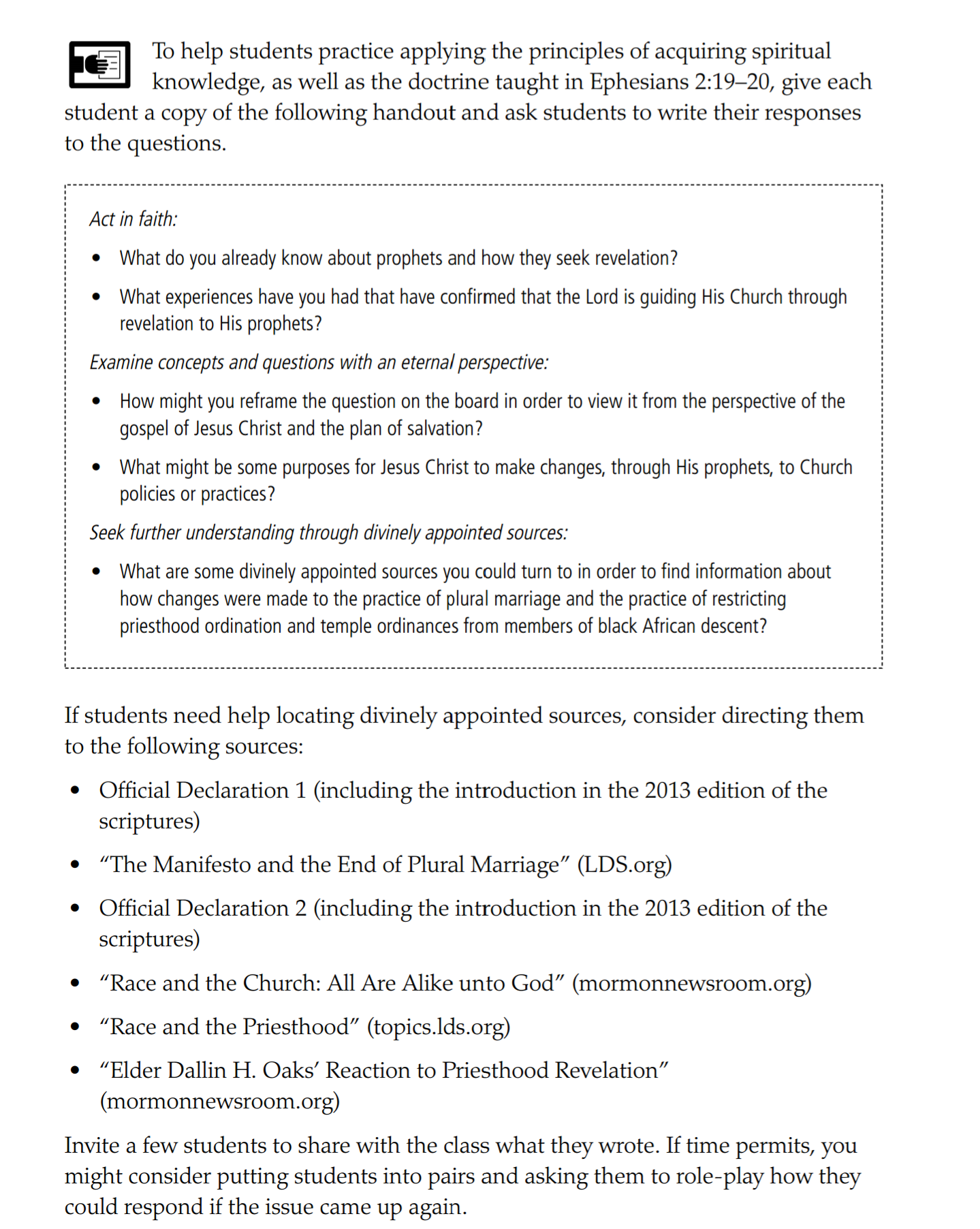 Exercise 3 asked the students to consider how they might respond to a scenario involving a family member expressing his opinion that, “given enough social pressure, the Church’s current position regarding a social issue will change in the future to be more in line with society’s position.” The family member gives as evidence the church’s history with plural marriage and the priesthood ban. The manual listed several resources to help students develop a response, including Gospel Topics essays and a Mormon Newsroom piece about Elder Dallin H. Oaks.