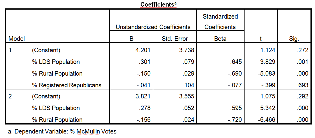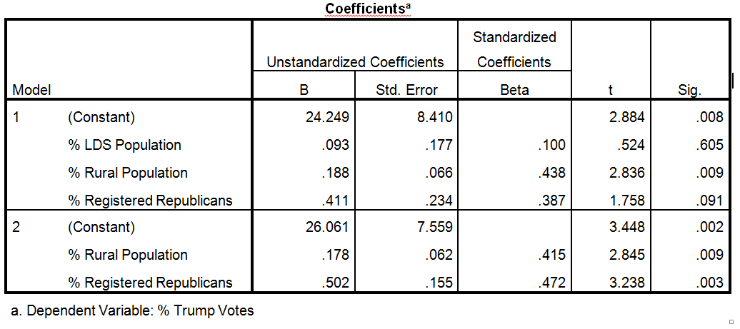 To explain the table, basically we add all 3 variables (% LDS, % Rural, and % Registered Republicans) to start the model and see which variables are most significant. If a variable has a significance level less than .05 (last column) then we say it is statistically significant. If a variable is >.05, then we remove the least significant variable (the one with the highest value–in this case % LDS is .605) from the model and re-run the analysis until all variables are less than .05.
