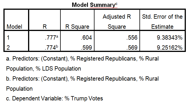 So how do you find the best predictors of Trump support in Utah? Excel just won’t do. You need a better statistical package. So, I ran the analysis again using all 3 variables as predictors of Trump support. When I do that, LDS support falls out of the model completely. Percent Rural and Percent Registered Republican are the only statistically significant predictors of support for Trump as shown in the table below.