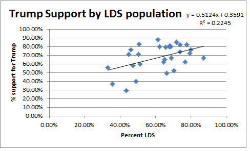 MaryAnn gave some excellent analysis in wondering if LDS population was a good predictor of Trump support in Utah. It turns out that she was right–LDS population by county was statistically insignificant in the analysis. The best predictors of a Trump supporter were % Registered Republicans, and % Rural.