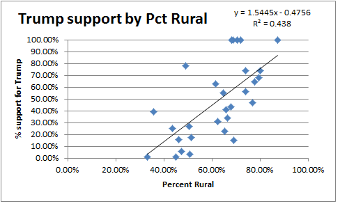 What was not considered in either analysis was the education level of the voters. One would expect, as shown in the national polls, that lower education levels would correlate to votes for Trump. This might explain the rural votes as well.