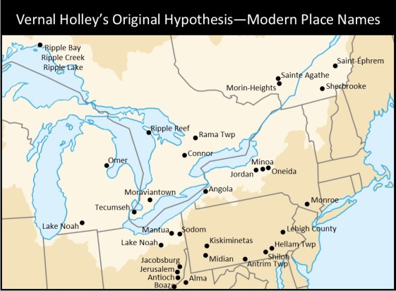 TL:DR – In 1983, Vernal Holley proposed a list of names and corresponding maps to prove the Book of Mormon setting was based on the Great Lakes region (and therefore fictional). Holley presented 29 modern place names as inspiration for locations in the Book of Mormon (out of 86 unique Book of Mormon geographical names). Based on new research, 17 of those proposed correlations can be proven invalid. However, church critics can still legitimately point to 16 correlations as possible sources of plagiarism. Confused? Details below.
