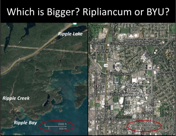 Ripple Lake (as the waters of Ripliancum) – I don’t know how in the world Holley came up with this other than looking at an index of all names used on topographical maps in Canada (that’s the database I had to use, anyway). Holley makes a big deal about the occurrences of Ripple Lake, Ripple Creek, Ripple Bay, and Ripple Reef as possible influences for the name Ripliancum. The only one I can find in ANY published records is Ripple Reef of Lake Huron in a modern Great Lakes pilot guide. Google maps can’t find it, though. The other three features are located far away along the remote north shores of Lake Superior. A train stop named Ripple was put there in the late 19th Century when the Canadian Pacific Railway was built. No idea if the station was named after existing water features or if the water features were named after it. To give you a scale of how small the area is containing Ripple Lake, Ripple Creek, and Ripple Bay, I created a graphic comparing it to the BYU campus in Provo. There’s no way this works for 1829 plagiarism.