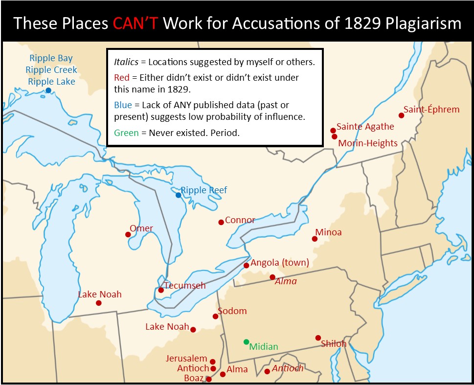 TL:DR – In 1983, Vernal Holley proposed a list of names and corresponding maps to prove the Book of Mormon setting was based on the Great Lakes region (and therefore fictional). Holley presented 29 modern place names as inspiration for locations in the Book of Mormon (out of 86 unique Book of Mormon geographical names). Based on new research, 17 of those proposed correlations can be proven invalid. However, church critics can still legitimately point to 16 correlations as possible sources of plagiarism. Confused? Details below.