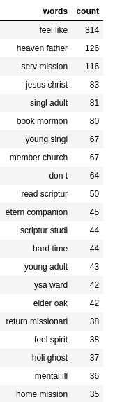 I expected to find topics such as “Heavenly Father”, “Jesus Christ”, the Book of Mormon, various forms of “singles ward” or “YSA ward”, various forms of “marriage” or “eternal companion”, and “scripture study”, so those didn’t initially catch my attention; however, those topics do contain some interesting questions that I’ll review. What was particularly interesting to me was the prevalence of terms such as “mental illness”, “hard time”, and, most of all, “feel like”. I wondered about the content and trend of these types of questions, so I ran them through a machine learning model that searches through the text, clustering the text into topics. Here are some of the interesting items I found.
