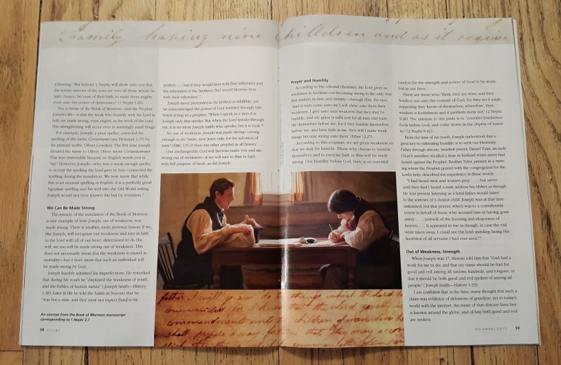 The article “Joseph Smith: Strength Out of Weakness” in the current Ensign is from a February 10, 2013 address Elder Nash, a member of the Seventy, delivered at the 70th Annual Joseph Smith Memorial Devotional. The address was published several years ago on the Revelations in Context website. In reference to the translation process, the original speech said,