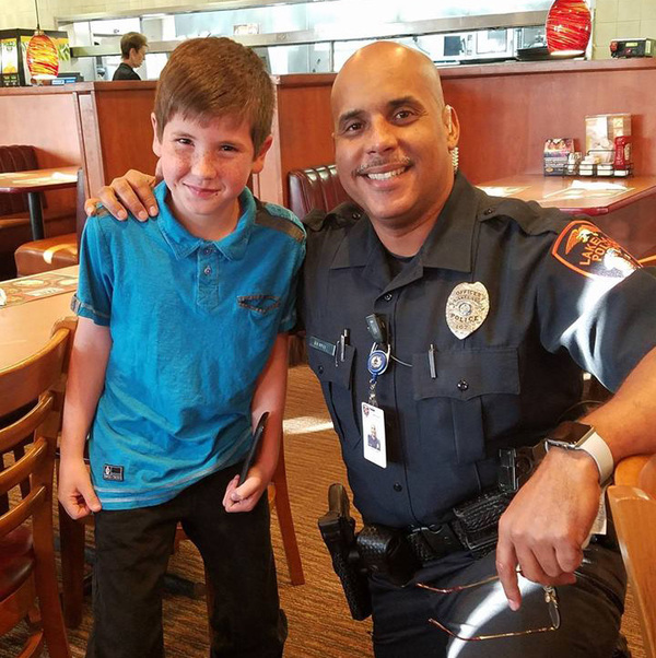 As they were waiting for their order, they noticed a police officer eating breakfast a couple tables over — the same one who’d written the tickets. How would they react? The boy, who’d always wanted to be a policeman when he grew up but was also very shy, consulted his mom who then asked the wait staff for a pencil and paper. The boy wrote a note, handed it to the cop, and hastily returned to his seat. He’d written “I want to be you when I grow up — thank you for your service” The wait staff had given him the policeman’s tab, and he’d spent his birthday money buying the cop breakfast. The cop was so touched that he not only came over to have his picture taken with the boy, but he even discretely called his supervisor and arranged to have the remaining two parking tickets “taken care of”.