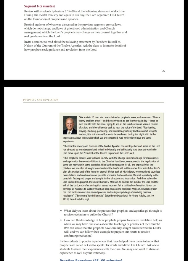 However, there is a bright side to Nelson’s statement popping up in the seminary curriculum. Just as students will see in their study of the Doctrine & Covenants and Church history, revelation comes from provocation (Ordain Women likes President Hinckley’s wording of “agitation”). The brethren wrestle with “thorny” issues, prompting their looking to the heavens for solutions. Nelson indicated that this was the case for the 2012 missionary age-change, which is not something I realized when President Monson made the announcement. It seemed to come out of the blue, but clearly church leaders were trying to fix something.