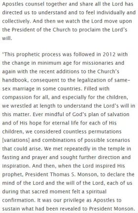 Note: Despite a long-standing, deplorable tradition of attributing to presidents of the church things they did or said when they were not president of the church, no president of the church can be quoted as having claimed the “POX” was by revelation. The closest you can come to that is the clarification letter signed by President Monson. That letter acknowledged that the original November policy needed to be corrected; it made some correction, and said nothing about the rest of it. Saying nothing about the rest could mean a variety of things.