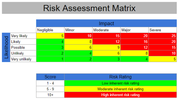 The first step in an effective controls program is to assess the inherent risk of a situation.. Inherent risk is understood by asking two questions: “How likely is it the event will happen?” and “If the event happened, how severe would be the impact?” Here’s a simple risk assessment matrix that illustrates how to use these questions to understand inherent risk.