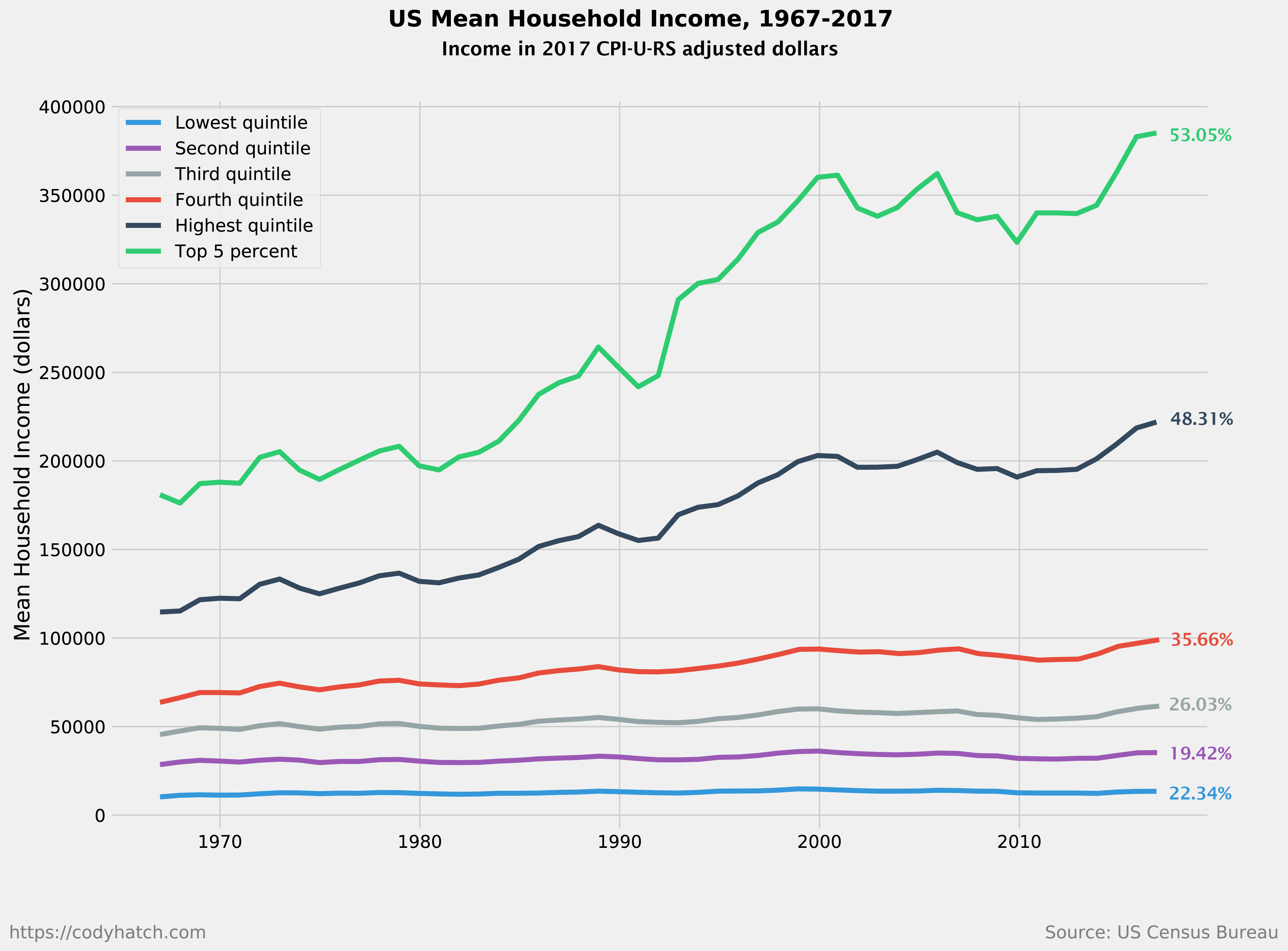 The above graph shows US mean household income, in 2017 CPI adjusted dollars, from 1967 to 2017. It is broken into quintiles and includes the top five percent of earners for comparison. I’ve also added the percentage growth for each line during the 50-year timespan.
