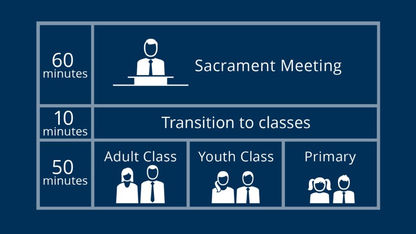 The Sunday Church meetings will consist of a 60-minute sacrament meeting each Sunday, focused on the Savior, the ordinance of the sacrament, and spiritual messages. After time for transition to classes, Church members will attend a 50-minute class that will alternate each Sunday. Sunday School will be held on the first and third Sundays. Priesthood quorums, Relief Society, and Young Women meetings will be held on the second and fourth Sundays. Meetings on the fifth Sunday will be under the direction of the bishop. Primary will be held each week during this same 50-minute period and will include singing time and classes.