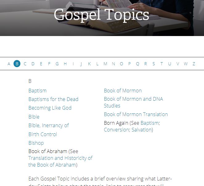 It should be noted that this entry seems to only be available in a newer version of the Gospel Topics section accessible in the Gospel Library app and directly via the link cited above. Navigating the menus from the home page of LDS.org will only take you to an older version of Gospel Topics, pictured below. The new section “Book of Mormon Geography” is not one of the available options in this older version.[2]