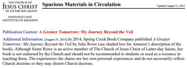 But then the Church released an interior memo to Church Educational System instructors in late August, specifically calling out Julie’s first book, A Greater Tomorrow, as inappropriate for classroom use. Although people assumed teachers were tempted to use Julie’s book for her end times predictions, Julie’s publisher later hypothesized that it was her visions of Old Testament events that were the real concern.