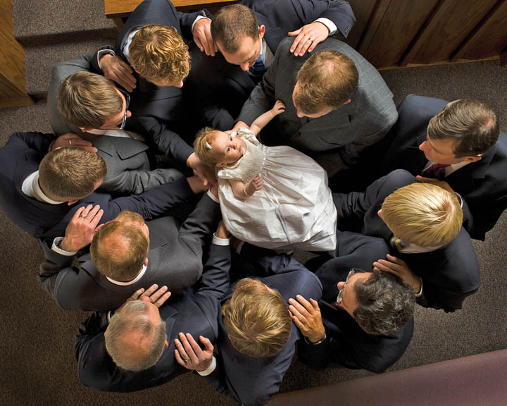 When a Mormon baby is born, it is given a name and a (father’s) blessing. This is traditionally done in front of the congregation, usually on the first fast Sunday following the birth or soon thereafter, but it can be done in the home with the bishop’s awareness (to create the certificate). Other men in the congregation who are Melchizedek priesthood holders, including male family members, and the bishop are invited to participate by placing their hands under the infant and holding it up while the blessing is given. Giving the baby’s full name as it will appear on the records of the Church is done at the beginning of the blessing, following a list of attributes and life experiences that are wished for the infant.