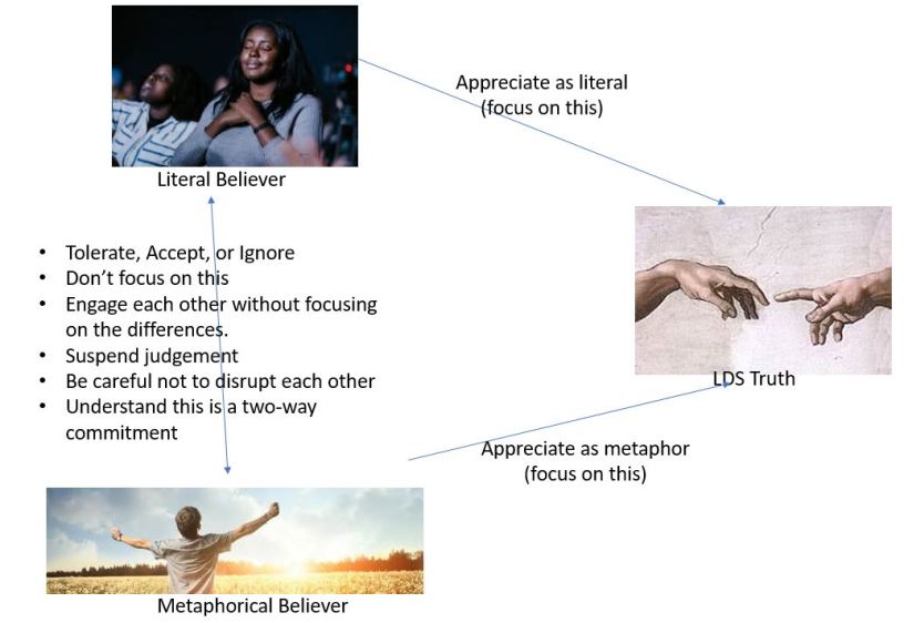 Meaning. The doubter can appreciate the lived experience and work to find meaning in ways they haven’t noticed before. Even an atheist can find significant meaning in being part of a worship and service community. The doubter can find meaning in the work of LDS theologians like Adam Miller and Terryl Givens that are helping to shift the LDS narrative into finding value in more pragmatic and intellectually viable teachings. The doubter can work to find meaning in symbols and metaphors and not get hung up on the implausibility of the literalness of certain scripture and church history events. And at the same time, understand that their more traditional co-religionists are still going to talk about these events as literal and only find them meaningful if they are perceived as literal.