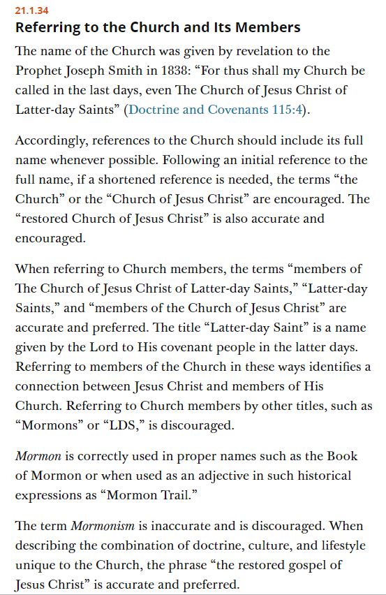 As always, I feel that this is a particular bugbear of President Nelson’s, and that some time after he passes away, we’ll go back to embracing “Mormon”, with nothing to show for it but a bunch of wasted time and money. While no one has gone as far as Nelson, there’s been multiple attempts to discourage “Mormon”, and every single one has failed. Even Joseph Smith had to resort to “Mormon means more good”.