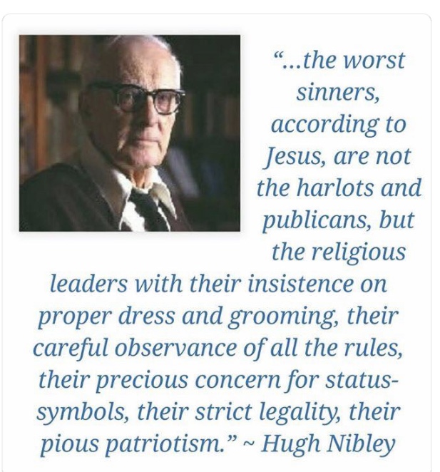 Hugh Nibley ironically said it best: “…the worst sinners, according to Jesus, are not the harlots and publicans, but the religious leaders with their insistence on proper dress and grooming, their careful observance of all the rules, their precious concern for status-symbols, their strict legality, their pious patriotism….; the haircut becomes the test of virtue in a world where Satan deceives and rules by appearances.”