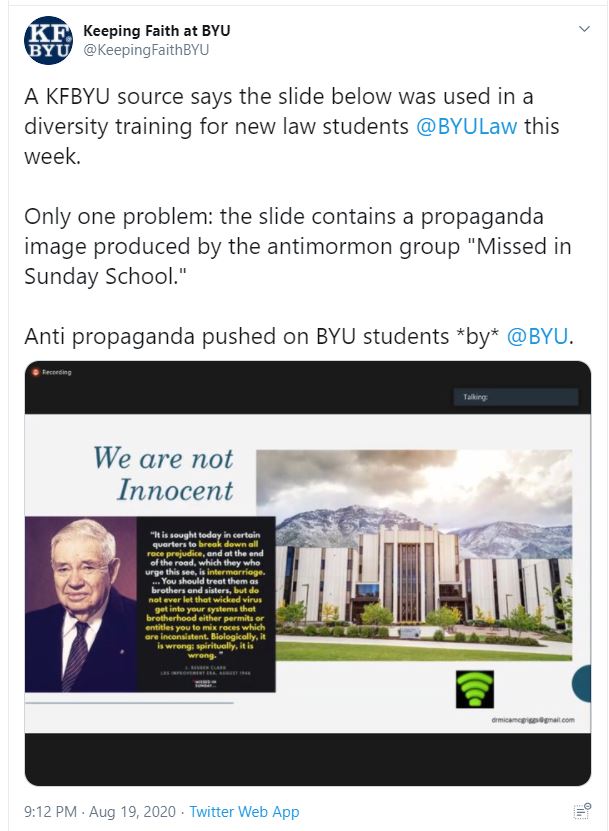 I saw a particularly concerning conversation on the Keeping Faith at BYU Twitter account last week. The account tweeted a pic of a diversity training slide from the BYU law school. The point of the tweet was to show that BYU professors used a meme from a website known to be very critical of the Church. The meme itself displayed an old quote from President J. Reuben Clark, Jr., stating that interracial relationships were “wrong” both physically and spiritually.