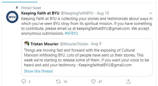 But what about the BYU petition? Like I pointed out last week, one of the authors of the petition, Tristan Mourier, sees the “Keeping Faith at BYU” effort as “exposing Cultural Marxism infiltrating BYU.”