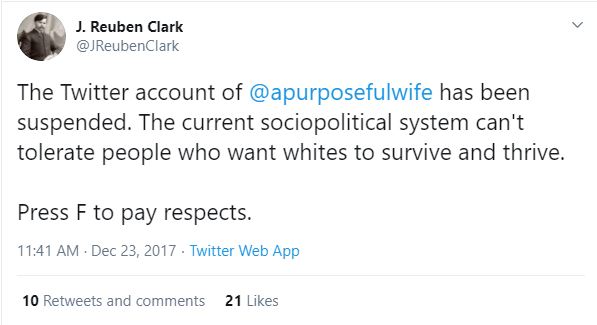 Late in December 2017, Ayla’s Twitter account was suspended. In announcing the suspension, Latter-day Saint @JReubenCIark added, “The current sociopolitical system can’t tolerate people who want whites to survive and thrive.”