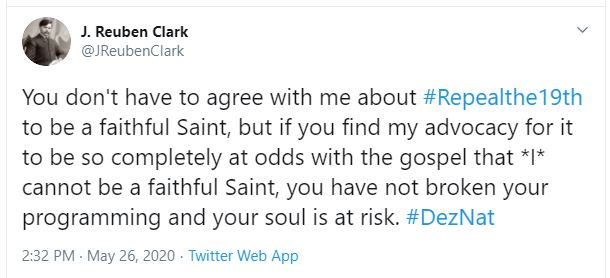 Now we jump forward to the creation of the #DezNat hashtag in August 2018 by Twitter user @JPBellum. As I said in my post a couple weeks ago, Bellum wanted to carve out a safe space on Twitter for “all who were willing to build the kingdom and defend the church and its leaders online.” DezNat stood for Deseret Nation, or, more appropriately, Deseret Nationalism.