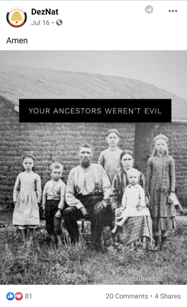 Overt alt-right ideas still occasionally poke through in more recent DezNat posts. One example is the DezNat Facebook page sharing a meme created by Identity Dixie, a NeoConfederate propoganda group. The meme shows a nineteenth century photo of a white family on a farm with the phrase “Your Ancestors Weren’t Evil.”