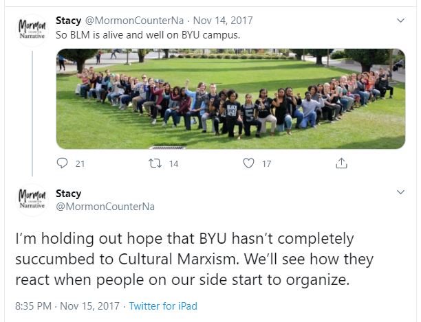 On Twitter, Stacy lamented, “I’m holding out hope that BYU hasn’t completely succumbed to Cultural Marxism. We’ll see how they react when people on our side start to organize.”