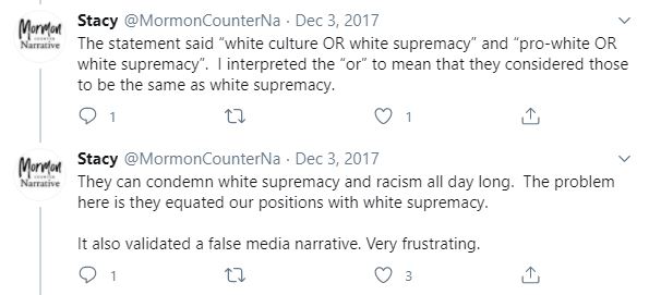 Ayla did not take the amended statement well. “My church just declared that I, as a white person, have no culture. Despite my never claiming supremacy of any kind & advocating for ALL ppl.” Other Latter-day Saints were similarly frustrated. In a later discussion on the statement, Stacy (@MormonCounterNa) indicated she had no problem with the Church condemning white supremacy and racism. “The problem here is they equated our positions with white supremacy.”