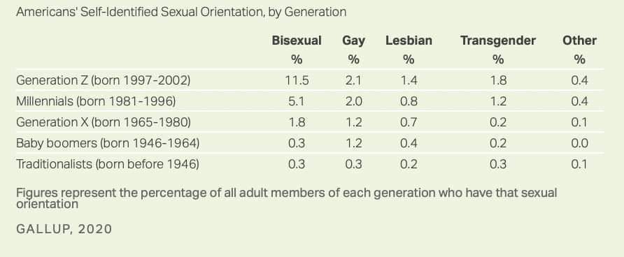 A study out this last week also shows that the youngest generations have a much higher percentage that identify as LGBTQ than previous generations.