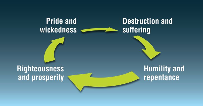 While most journalists who have reported on this connection have done so with a sneering derision, perhaps righty so, calling these ideas “crackpot theories” and “superficial,” my Mormon spidey senses immediately started tingling when I heard that Bannon sees “time as a cycle” whereas most others (particularly non-conservatives) see “time as a progression.” The Book of Mormon famously talks about time as a cycle, a “pride cycle.” There are plenty of similarities here, even though the Book of Mormon doesn’t specify an 80 year cycle like Bannon’s favorite read does. The Book of Mormon pride cycle is deliberately vague, but posits that society goes through the following cycle over and over throughout time: