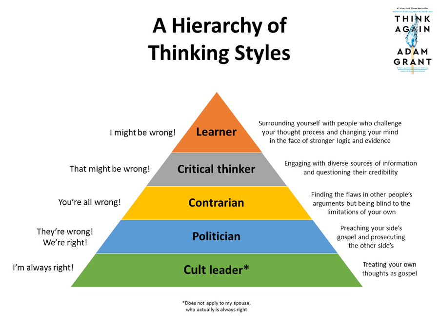 I’ve been reading Think Again by Adam Grant, a book which I confess is taking me a while to get through. The gist of the book is that our ways of thinking are entrenched in such a way to give us overconfidence in our positions, and that unless we deliberately challenge our beliefs, our thinking is designed to lead us into error. He suggests the following model as a hierarchy for thinking styles: