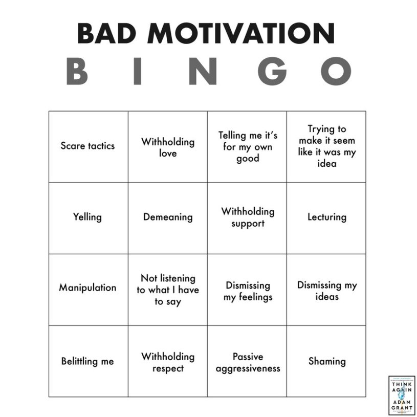 I’m on a bit of an Adam Grant kick lately. Another topic he has discussed is when we apply negative forces to motivate others to comply with our way of thinking. He identifies several of these motivation tactics, and why they don’t work: