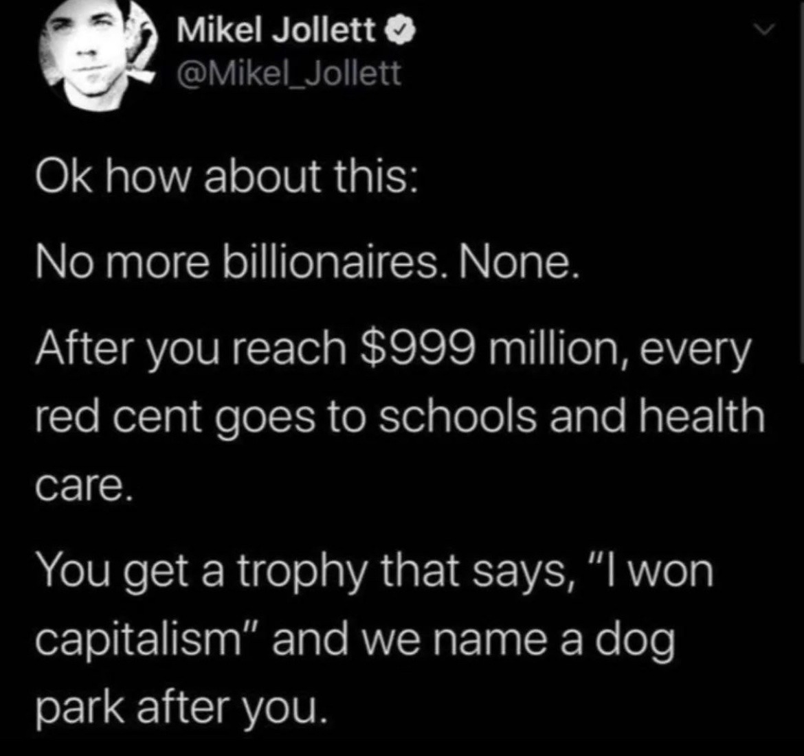 [image id: A tweet that says, “Okay, how about this? No more billionaires. None. After you reach $999 million, every red cent goes to schools and health care. You get a trophy that say, “I won capitalism” and we name a dog park after you. End id.]