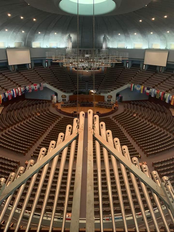 Photo Credit: Brian Seever of Quimby Pipe Organs took this photo after tuning the antiphonal organ at the rear of the Auditorium conference chamber, looking out over the horizontal trumpet en chamade pipes. His company maintains and tunes the Auditorium’s Aeolian-Skinner organ and the Casavant organ in the Temple.