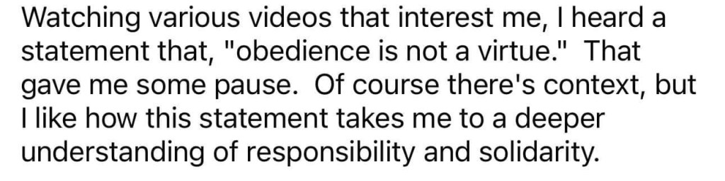 To expand on your quote, “Obedience isn’t a virtue.” I would rephrase it thusly. Obedience isn’t a virtue. It is a behavior. Even the devil’s followers are obedient.